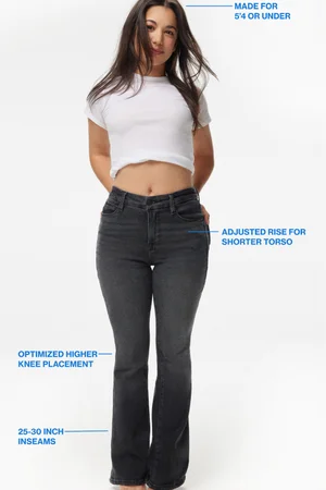 Just as with regular jeans, it’s all about style preference and fit. Styles like petite skinny jeans or petite flare jeans can help lengthen the look of your legs, while high-waisted options like those in the Good '90s or Soft-Tech Denim collections enhance your silhouette. Petite straight jeans can also be flattering on smaller frames because of their clean lines and body-hugging material.